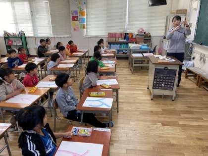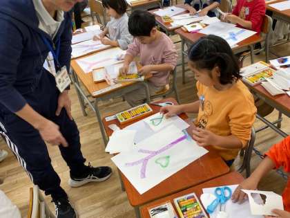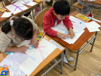 1年生の図工では、『いろんな木のみ』というタイトルで、パスを使って絵を描きました。
