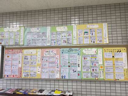 今、大江小学校の玄関ホールには、2年生の『まち探検』でお店にインタビューしたことをまとめた壁新聞が掲示されています。