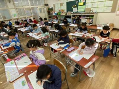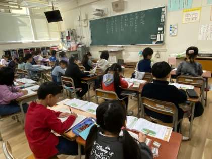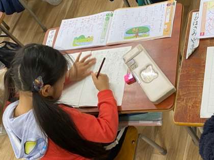 1年生の教室をのぞいてみると、漢字を含んだ短文をノートに写していました。
