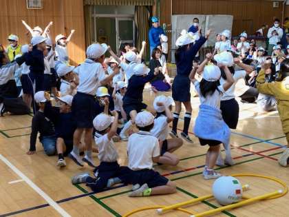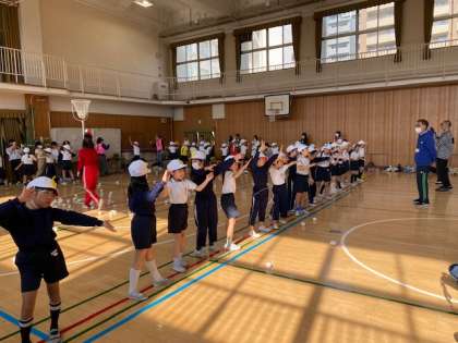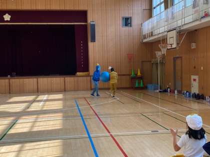 後半は、音楽が流れるとダンスし、鳴り止むと玉入れをするという、運動会で1年生がしたような玉入れで赤組白組に分かれて競いました。