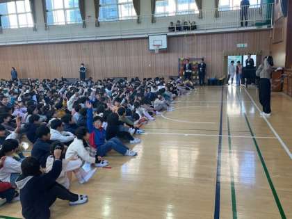 今日の児童朝会は、今日から新しくこられたサポーターの先生の紹介、タイピングやラグビーの表彰に続いて、校長先生から、昨年度、学校創立150年に大江小学校から放った風船が届いて温かいお便りを送っていただいた『ダイハツ京都工場』に、先週、5年生の社会見学として行ってきた時の話がありました。