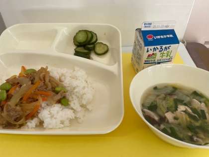 ピリ辛丼 中華スープ きゅうりの甘酢づけ