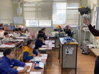 3年生の理科では、『重さをはかって表そう』ということで、はさみ・三角定規・電池・のり、という身近な文房具の重さをはかりました。