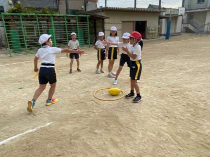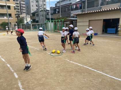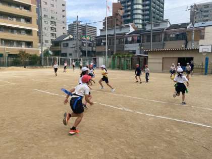 赤白に分かれて、相手チームのラグビーボールを獲ってきます。途中、タグを取られてしまうと、ペナルティーとして、その場で5回大きくジャンプします。制限時間終了までに、相手より多くボールを運んできたチームの勝ちとなります。