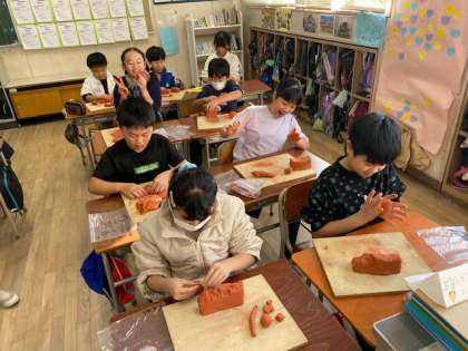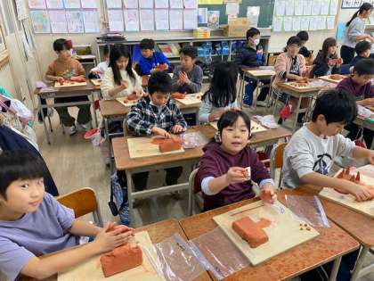 茶褐色の粘土をこねながら、自分の手の色をみて「ゾンビやー」と言っていました。