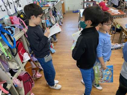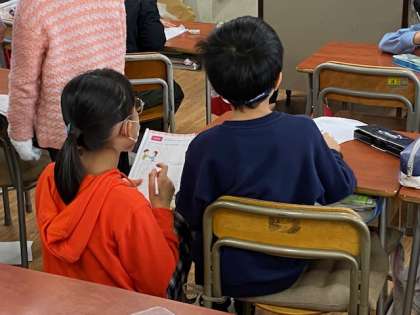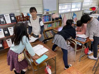 3年生の外国語活動では、より多くの友だちにイニシャルをたずねよう、と取り組んでいました。
