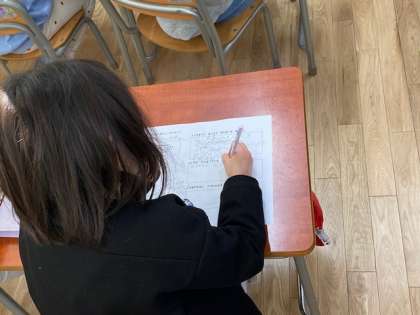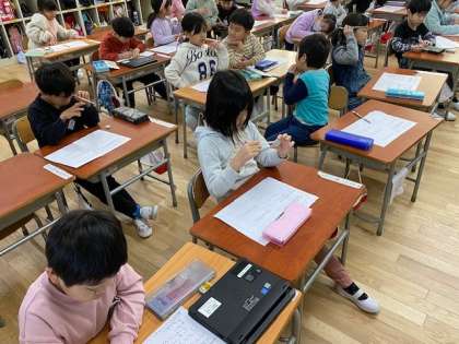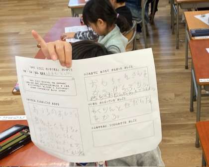 1年生の生活科では、『かぞく にこにこ だいさくせん けいかく』と題して、お家の仕事にはどのようなものがあるのだろう、自分がしていることは何だろう等について、考えて書いていました。