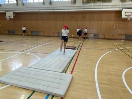 5年生の体育では、走り高跳びに取り組んでいますが、今日は、バーに見立てたゴムに黄色の折り紙を半分に折って乗せていました。これは、跳んだ際、体の一部の引っかかり具合によって折り紙が落ちるような仕掛けでした。