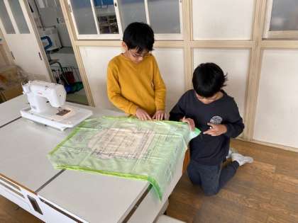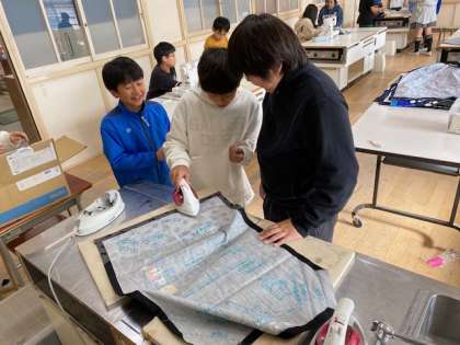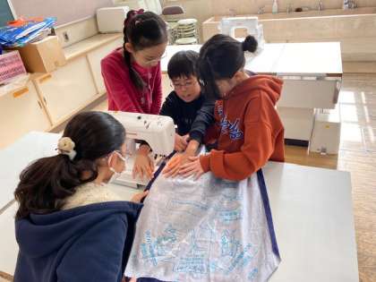 5年生の家庭科では、エプロンづくりに取り組んでいました。それぞれの工程について、ペアやトリオ、グループで教え合いながら作業を進めていました。