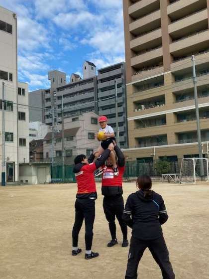 ラインアウトの体験では、ジャンケンで勝った子が高い位置まで持ち上げてもらいました。ハイパントされたボールも受ける体験もさせてもらいました。