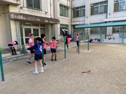 6年生の体育では、鉄棒、二重跳びなどの一人跳びの縄跳び、連続8人跳びなどの複数人跳びの三方に分かれて、目標を決めて取り組んでいました。