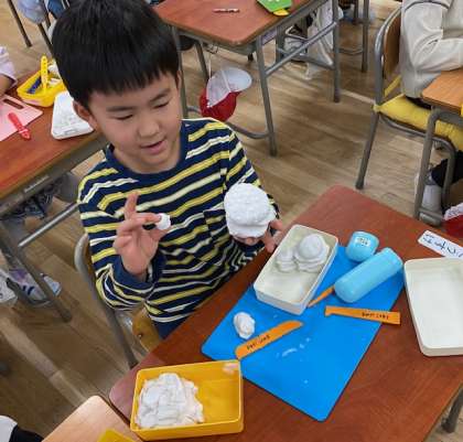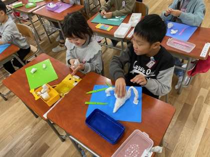 1年生の教室をのぞいてみると、粘土で造形活動をしていました。