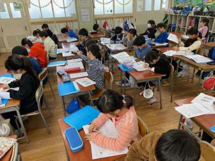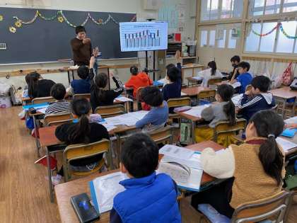 3年生の教室をのぞくと、総合的読解力を育成することを目的に、文章とグラフを読み解く授業をしていました。