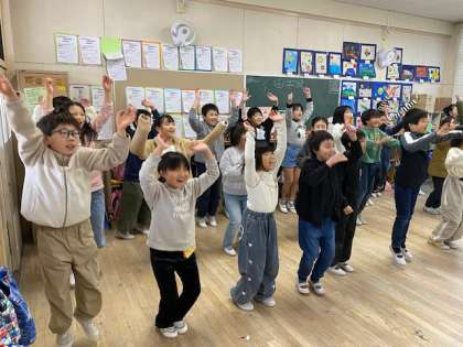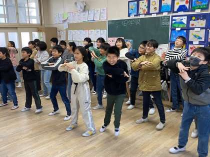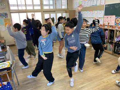 4年生の教室をのぞくと、近々行われる学年集会に向けて学級の出し物となるダンスの練習をしていました。