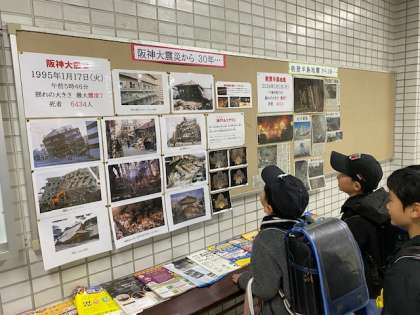 今年も1月17日が近づいてきました。登校してきた子たちはエントランスホールの掲示板に目をやり、30年前のことや能登の災害について、思いを巡らせていました。
