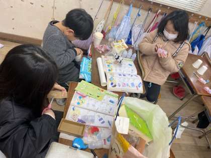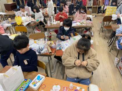 2年生の図工では、ゴムを利用したものや空気圧を利用したものなど、これまでに学習した原理を活かしておもちゃ作りをしていました。