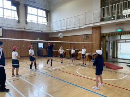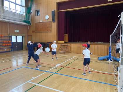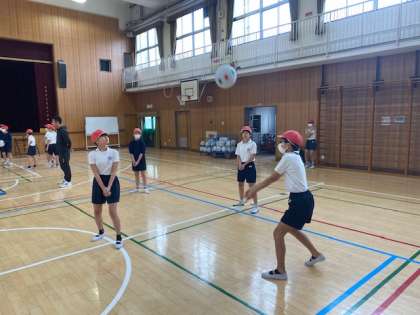 5年生の体育では、ソフトバレーボールを使ってキャッチバレーボールに取り組んでいました。