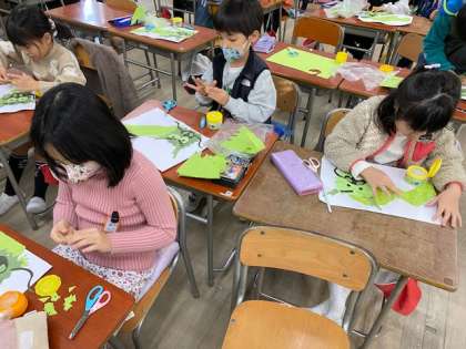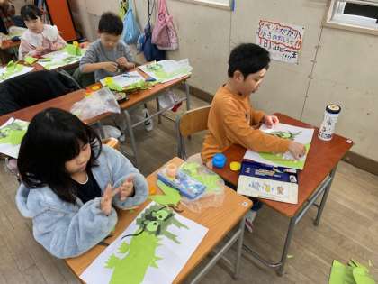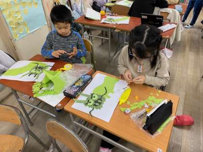 2年生の教室をのぞいてみると、龍の貼り絵に取り組んでいました。優しそうな龍もいれば、迫力のある龍もいて、一人ひとり個性が感じられました(^^)