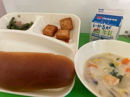 1/22(水)_本日の給食 公開日 2025/01/22 更新日 2025/01/22 お知らせ はくさいのクリーム煮 あつあげのピリ辛じょうゆかけ 豚肉とさんどまめのオイスターソースいため いいね(0)