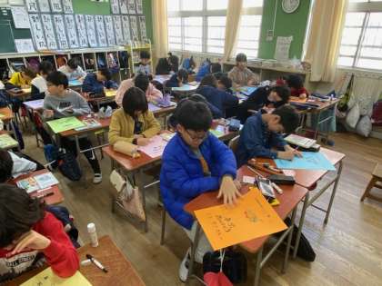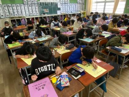 5年生の教室をのぞいてみると、6年生一人ひとりへのメッセージカードの表紙を作成しているところでした。
