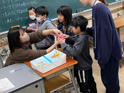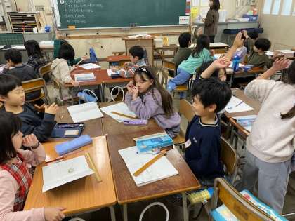 2年生の算数では、両手を左右にのばした長さをはかろうと取り組んでいました。