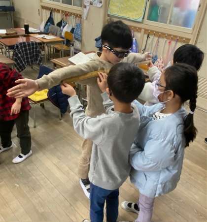 子どもたちが持っている長さを測るもので最も長いものは30cmさしです。さあ、子どもたちはどのように、この長さのものを測るのでしょうか。