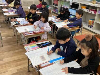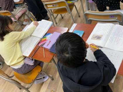 子どもたちは、オオアリクイやライオンについて書いてあるところを教科書から見つけ、赤黄青の色鉛筆で色分けして線を引いていました(^^)