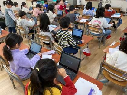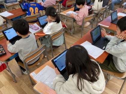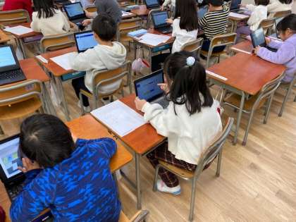 1年生の教室をのぞいてみると、学習者用端末で『ナビマ』に取り組んでいました。『ナビマ』とは、いわゆるAIドリルのことで、学習したことができていれば、難易度が上がっていきますし、理解できないと判断されると前段階に降りて、そこからの学習を進めてくれます。