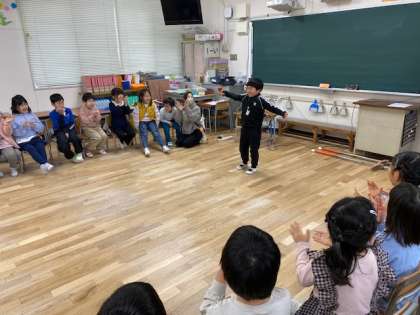 1年生の教室をのぞいてみると、この1年間でできるようになったことについて発表をしていました。