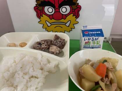 くじらのたつたあげ 豚肉とじゃがいもの煮もの 白花豆の煮もの