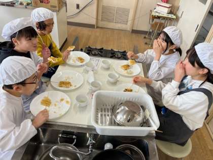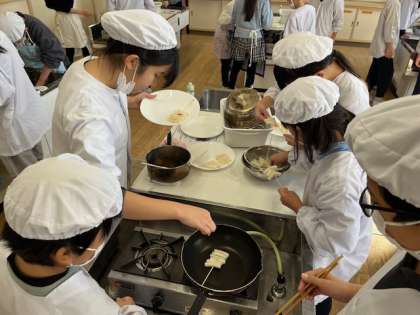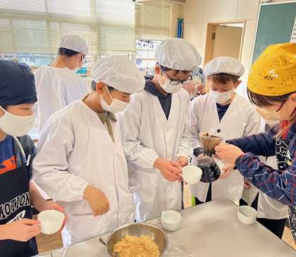 5年生の家庭科では、トッポギでみたらし団子を作る調理実習をしました。