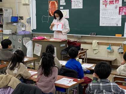 2年生は、今日、歯科衛生士の方にお越しいただいて、歯みがき指導をしていただきました。
