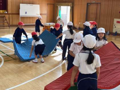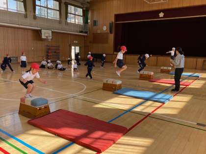 1年生の体育では、跳び箱を使った運動にチャレンジしていました。跳び箱の学習準備も自分たちでできるようになりました(^^)