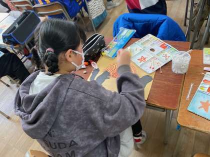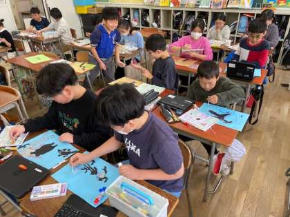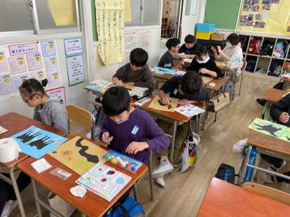 5年生の図工では、現在、『アボリジニアート』に取り組んでいますが、今日は綿棒でカラフルなドットをつけていました。少しずつアボリジニアートらしくなってきているようでした。(^^)