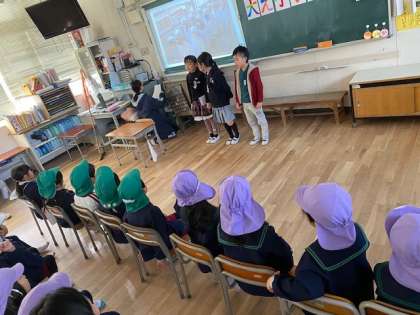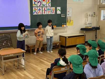 1年生は、小学校での生活がどんなものなのかを実演つきで紹介していました。