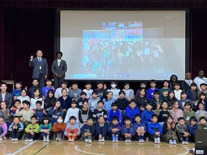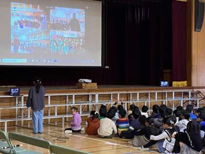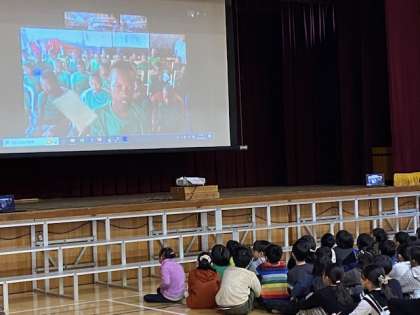 そうです。このタイミングでルワンダのバツィンダ小学校とオンラインでつなぎ、講堂のスクリーンには大きくその様子が映し出されました。