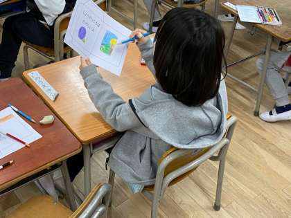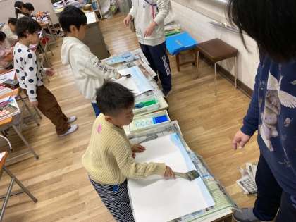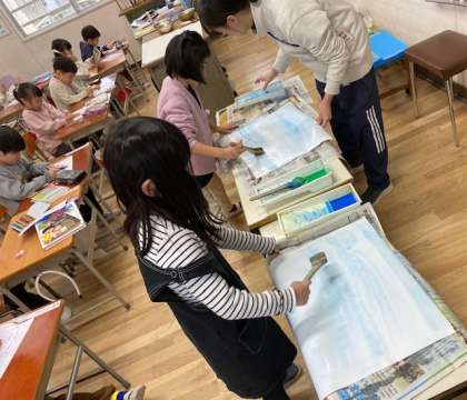 1年生の図工の時間をのぞいてみると、順番に前に出てきて、画用紙に水色の水性絵の具を、はけでうっすらと塗っていました。