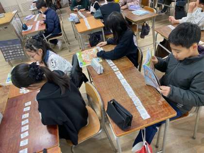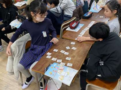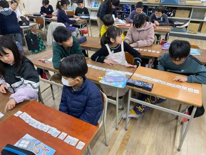 その下準備をした後はゲームです。机にずらっと並べた(学校の色々な場所がかかれた)カード、ジャンケンをして勝ったら端から順に進んでいきます。スタートは右側の席の子は右端、左側の席の子は左端です。