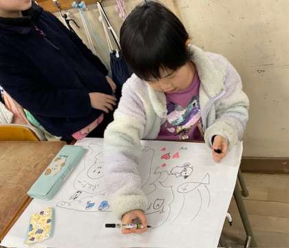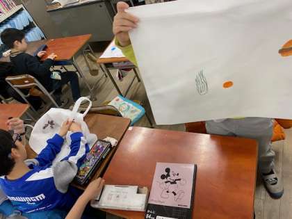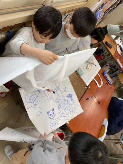 2年生の教室をのぞいてみると、作品袋に絵を描いているところでした。