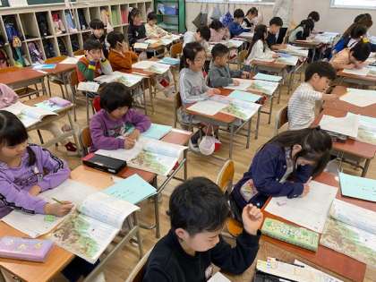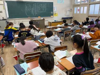 1年生の国語では、『スイミー』という物語について学習していますが、今日は、スイミーの感じたことや、赤い小さな魚たちの様子について読み取っていました。