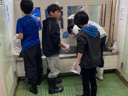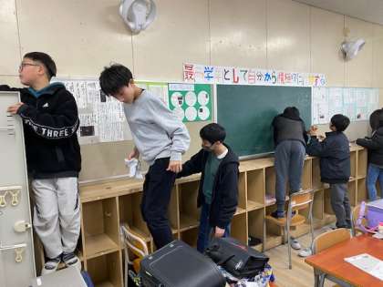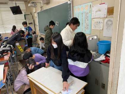 6年生の家庭科では、教室の前後にある黒板や、窓のさん、ロッカー、学級文庫、手洗い場、廊下、靴箱などなど、これまで使ってきたきた所をきれいにしようと取り組みました(^^)