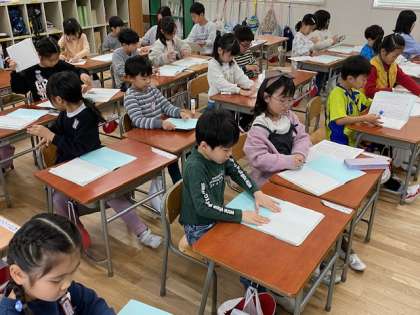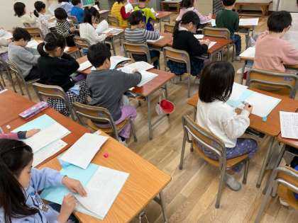子どもたちは返されたプリントをプリント綴りに貼っていました。