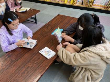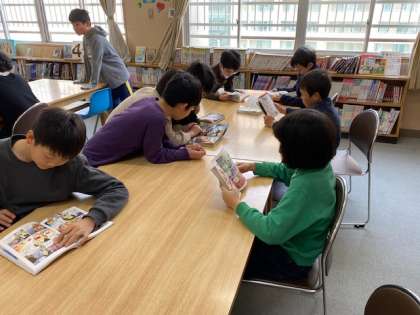 一人で集中して本を読んでいる子、何人かで1冊の本を見ながら楽しそうに話をしている子、それぞれの図書の時間の過ごし方がありました。