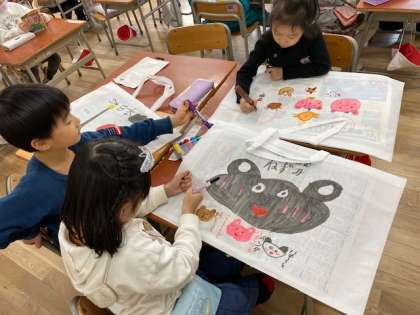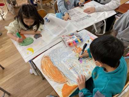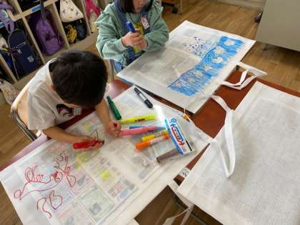 1年生の教室をのぞいてみると、作品袋を仕上げているところでした。子どもたちなのお気に入りの絵が並んでいました(^^)