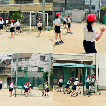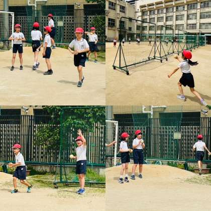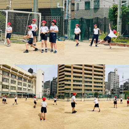 ソフトボール投げの練習を、安全に気をつけて行いました。投げる前に、大切なポイントをみんなで考えました。