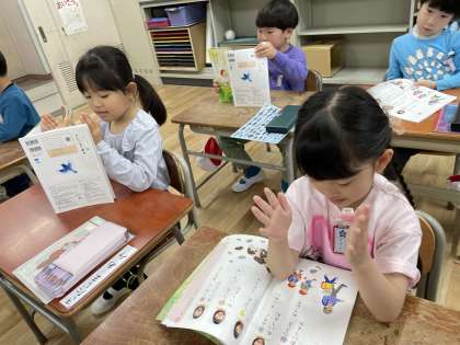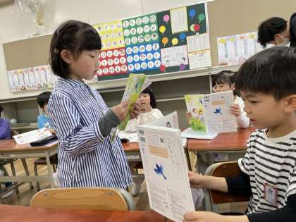 リズムにのって『あいうえおのうた』を楽しく読み、言葉のひびきに親しみました。
