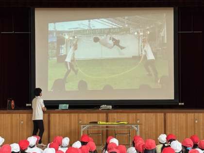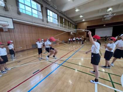 その後、各班に分かれて、ダブルダッチの練習をしました。教えて頂いたことを試行錯誤しながら、子どもたちどうしで教え合う姿が見られました。とてもよい経験ができました。