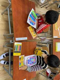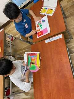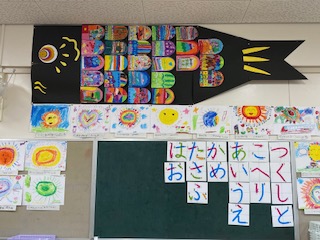 こどもの日の「こいのぼり」を作りました。学級で大きなこいのぼりを作ります。うろこのデザインや色づかいを考えてパスで塗り込みました。