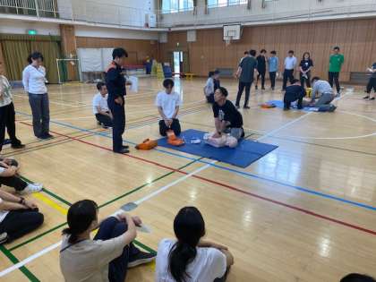 夏のプール水泳を前に、2時間強の時間をかけて、天王寺消防署の救急隊の方々を講師に、救命救急講習会を行いました。
