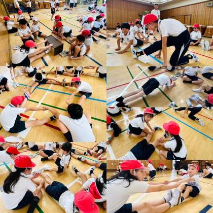 太ももの裏や腰回りの筋肉をゆるめることで、前屈がしやすくなります。子ども達は、友達と脚の裏全体をほぐし合ったり伸ばし合ったりして、記録測定に臨んでいました。